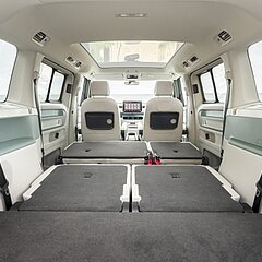 Möjlighet till många olika konfigurationer med förskjutningbar ö i mitten samt snurrbara kaptenstolar i andra raden vid 6-säteskonfiguration.